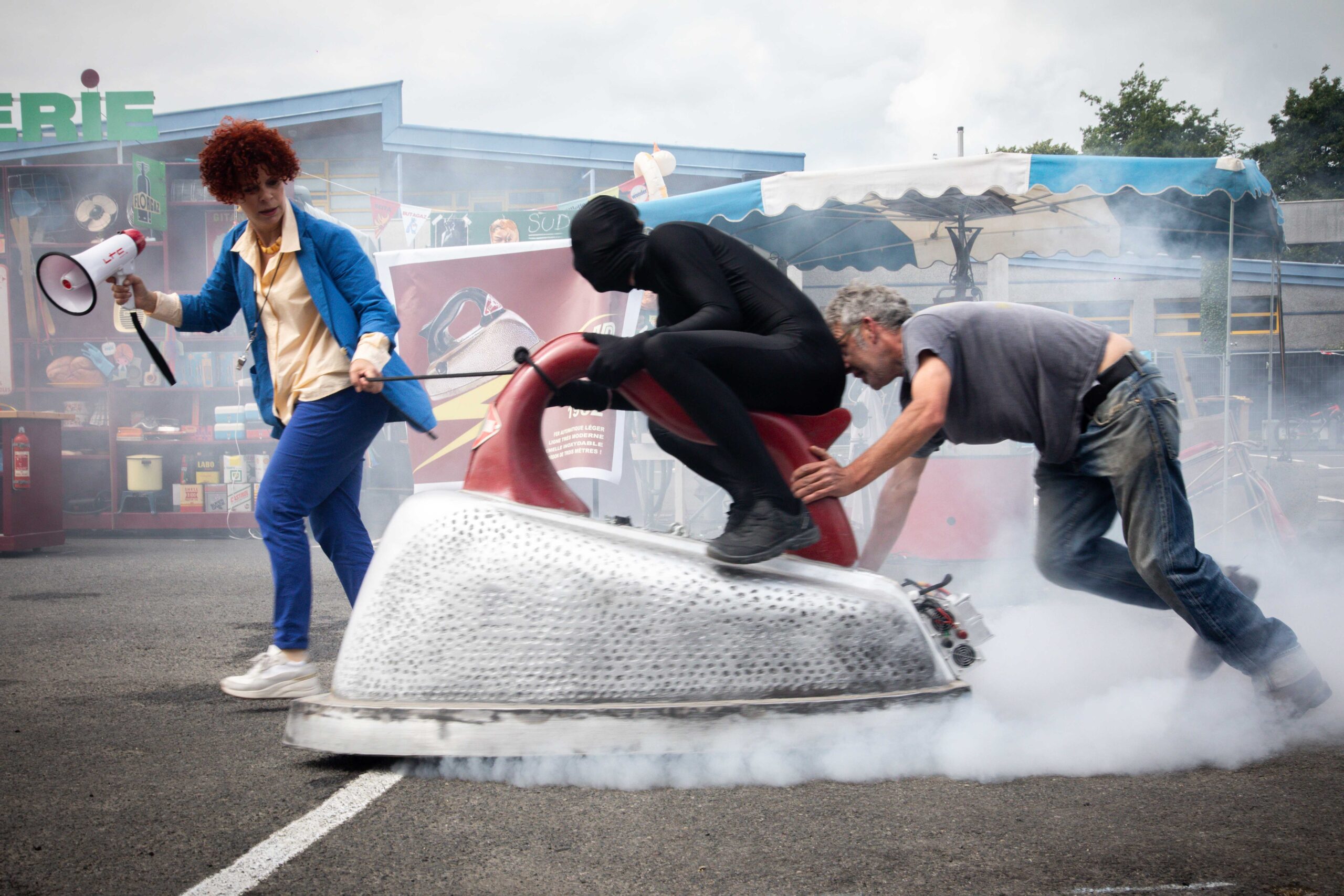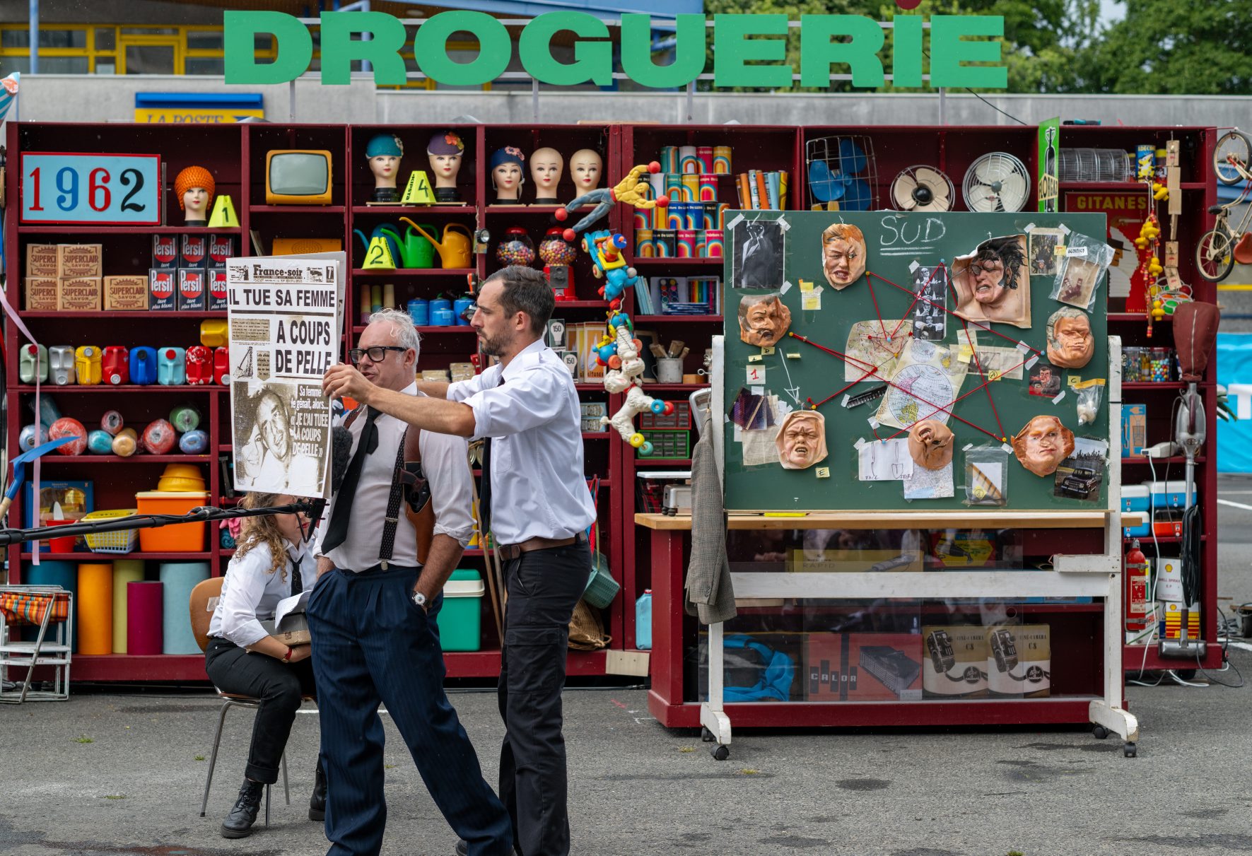 Cette collaboration hors du temps ricoche entre 2025 (époque réelle du tournage devant les spectateurs) et celle des polars cinéma : hommage aux ambiances machistes de style Michel Audiard (Les Tontons flingueurs, etc.). Mais ils travaillent pour la bonne cause car il s’agit rien de moins que de remonter la filière assassine de femmes trouvées le visage aplati d’un coup de pelle (de jardin) à travers les générations. Issu d’un fait divers actuel : « Elle me gênait, alors je l’ai tuée à coups de pelle ! »