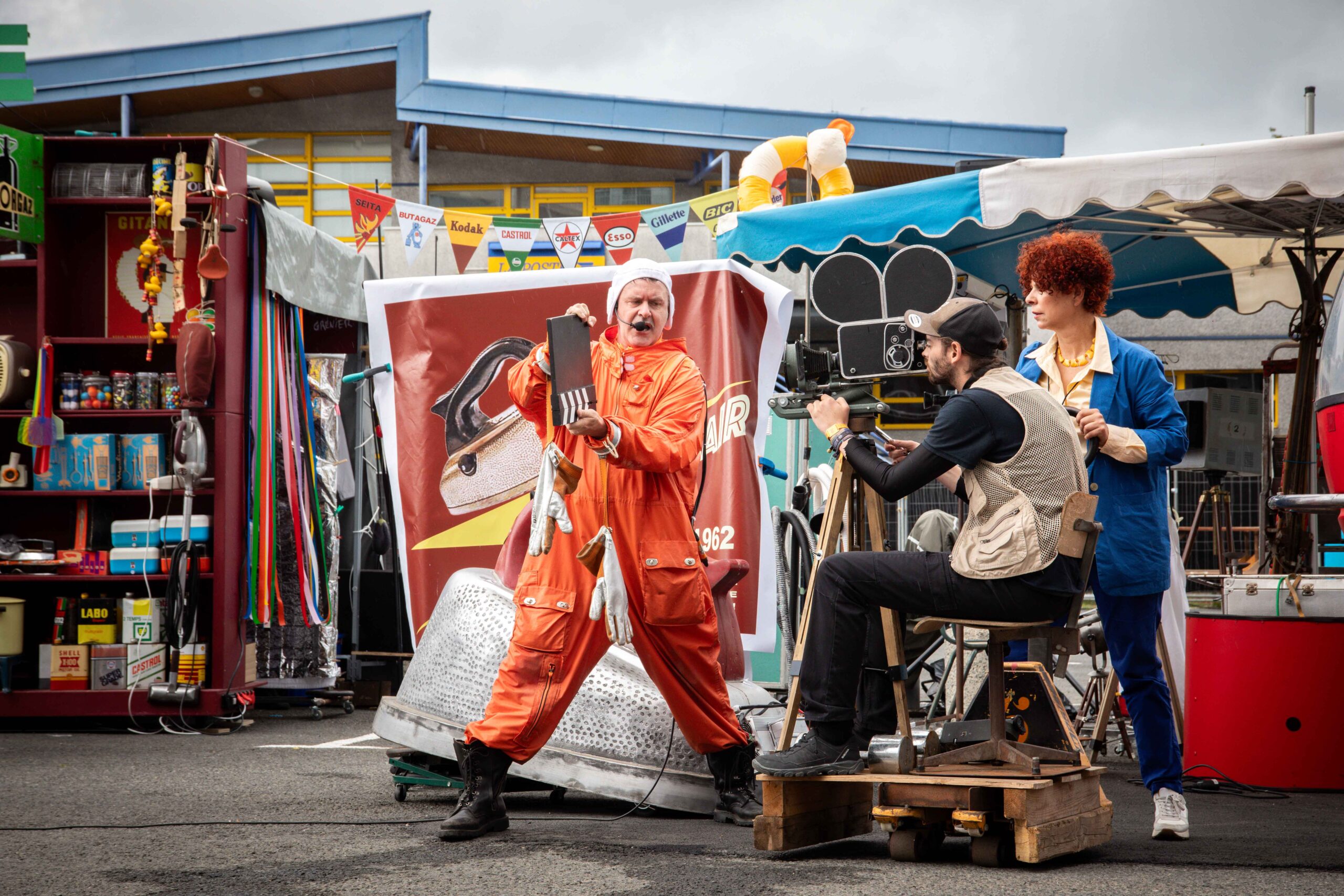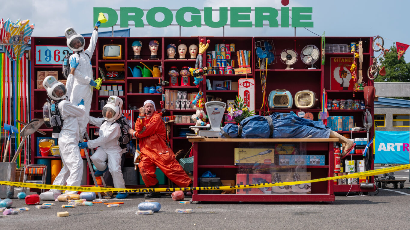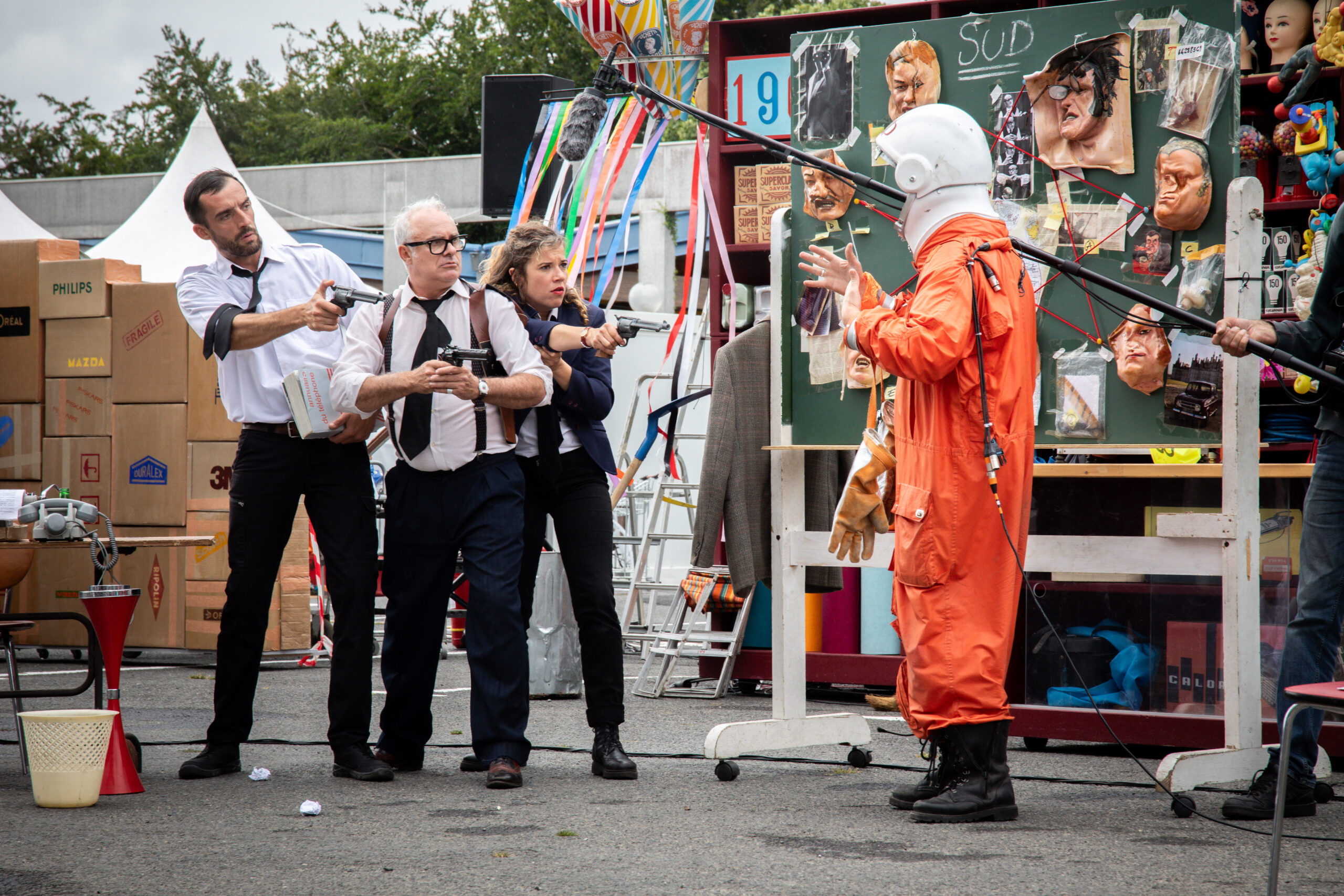 Et pour cause ! Le réalisateur est absent, le cameraman a raté son train et le producteur, occupé sur un autre tournage, s’est fait remplacer à la dernière minute. Seule la scripte a une idée approximative de l’enquête que doit mener un commissaire soviétique venu du futur (2200), pour résoudre l’énigme d’assassinats commis de père en fille et fils depuis l’année 1962, dans un magasin de droguerie.